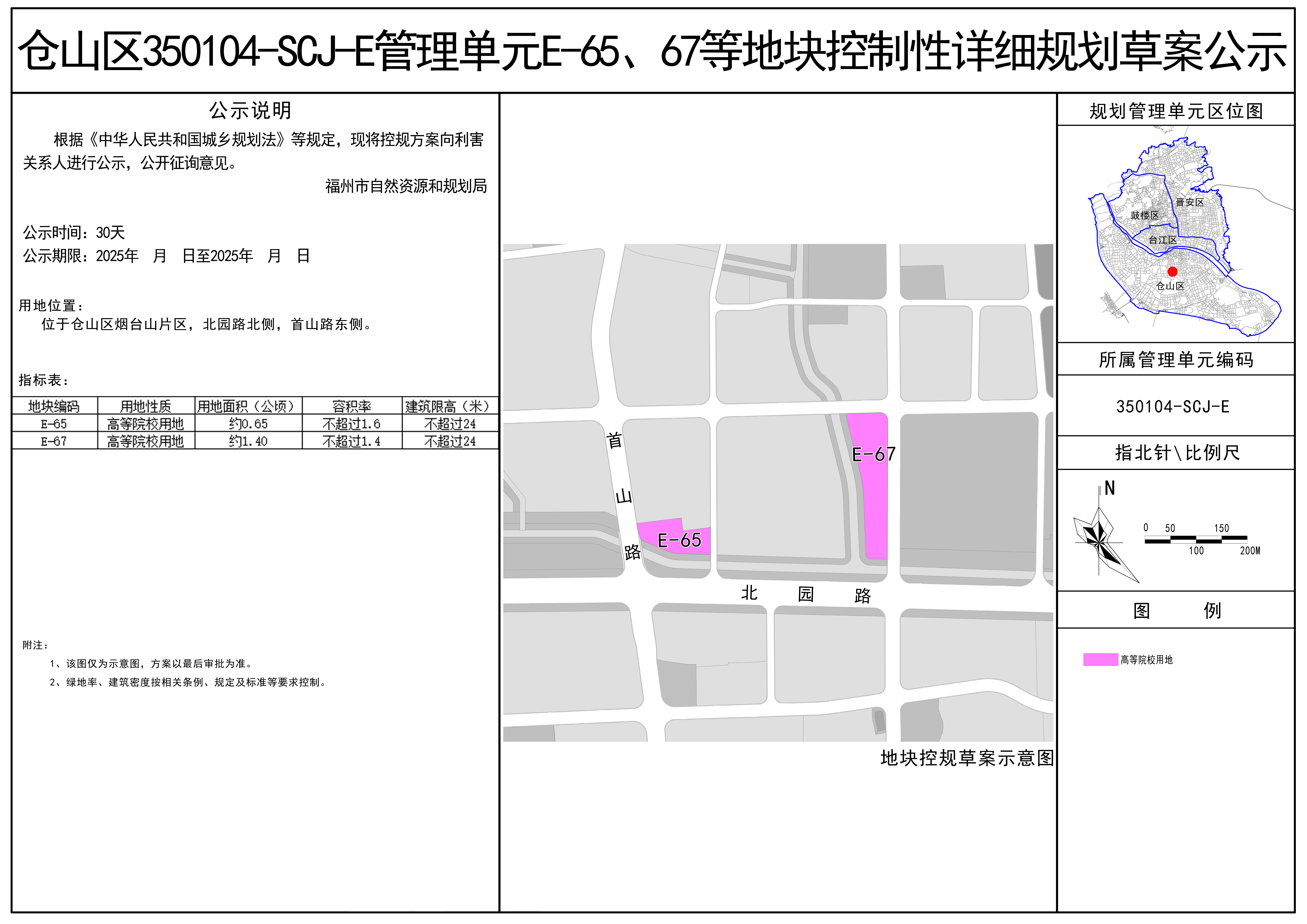 仓山区350104-SCJ-E管理单元E-65、67等地块位于北园路北侧,首山路东侧。该控规草案经研究审议,根据《中华人民共和国城乡规划法》等相关规定,现广泛征求社会各界意见,公示时间2025年10月29日至2025年11月28日,详情可查阅网站(/)。
