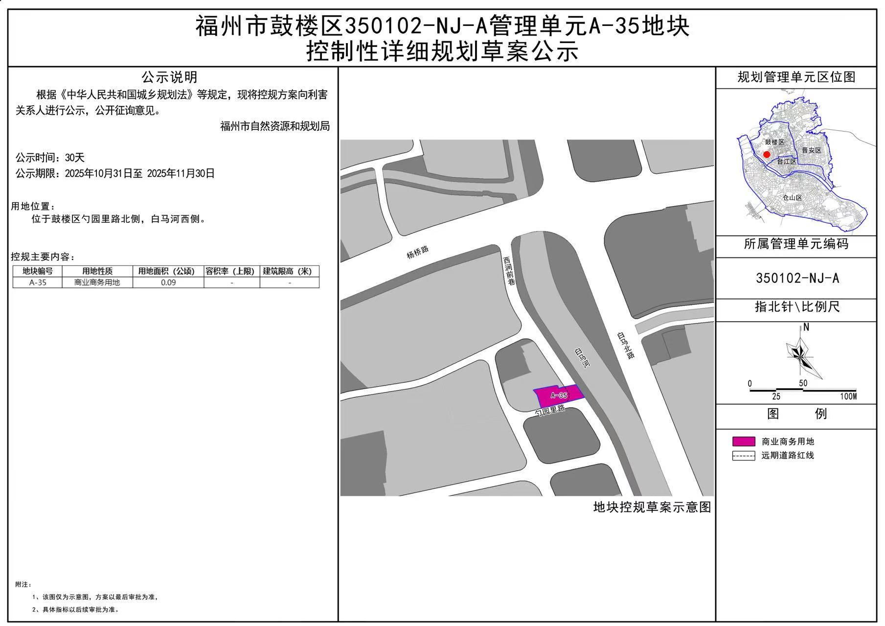 鼓楼区350102-NJ-A管理单元A-35地块位于鼓楼区南街片区,南至勺园里路,东邻白马河。该控规草案经研究审议,根据《中华人民共和国城乡规划法》等相关规定,现广泛征求社会各界意见,公示时间2025年10月31日至2025年11月30日,详情可查阅网站(/)。